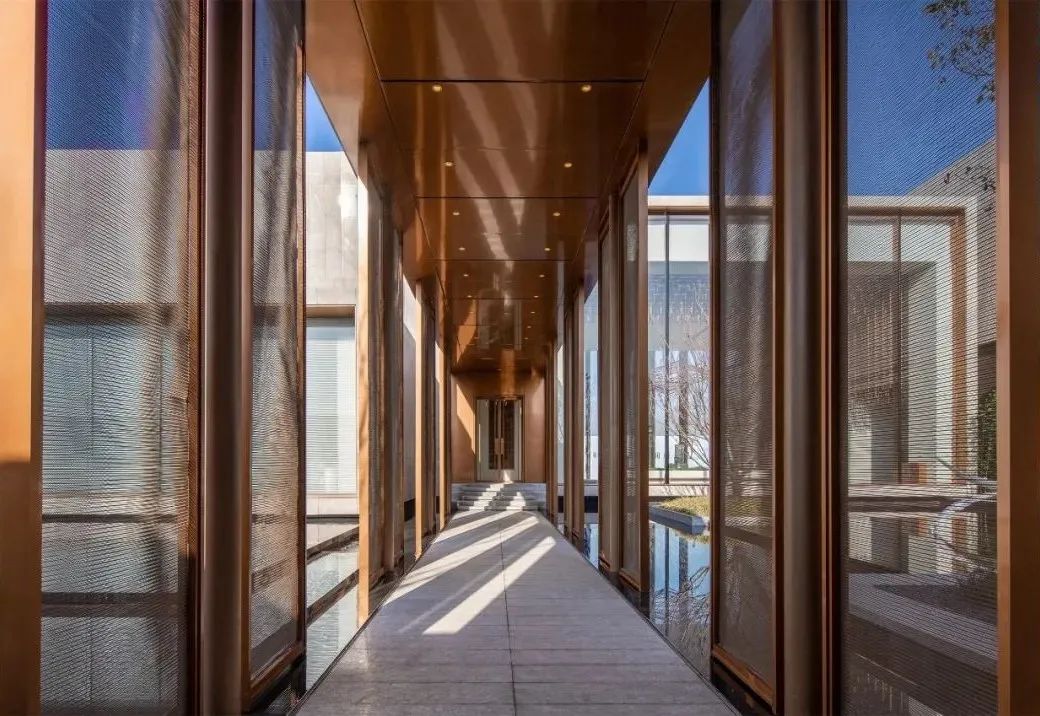 两进院落通过回廊在物理空间层面的隔断,在表达介质上则巧妙选用了兼顾视觉美与通透性的金属丝网,“犹抱琵琶半遮面”,光影在其中斑驳错落。