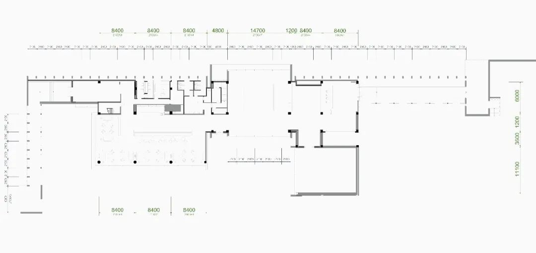 空间设计同样需要注重立体构成及线条的关系。由线到面,通过几何线条的介入将形体关系简化。外立面大部分采用2.1米宽的模数,与8.4米间距结构柱网对齐,在标注模数的序列演绎下,整个建筑成为一个不可分割而又和谐共生的空间场所。