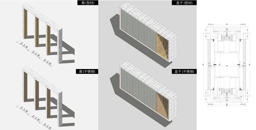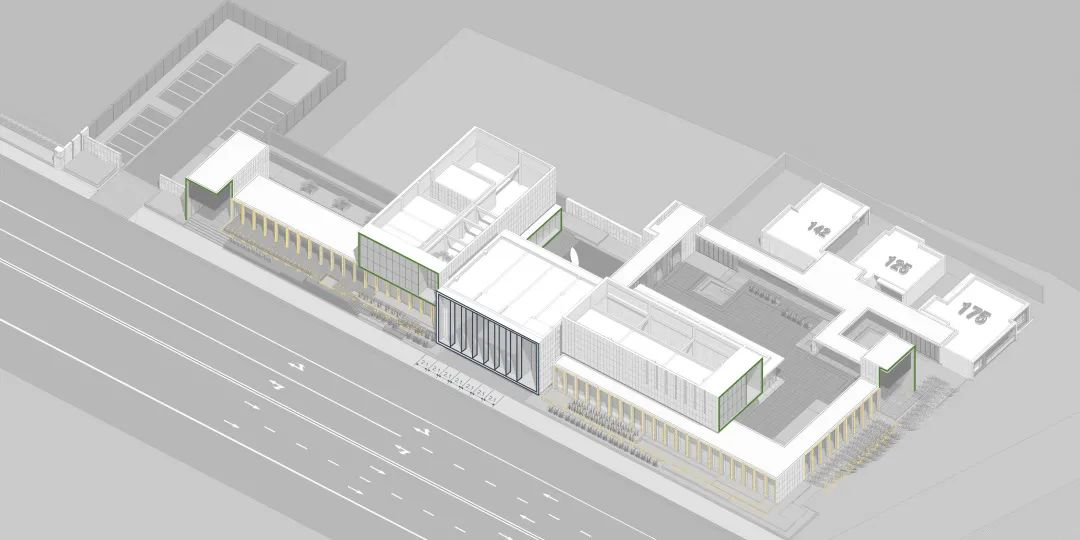 在对模数化的研究基础上,整座建筑最为完整的展示面主要以沿街城市街景为主,设计同样关注此立面的竖向尺度关系。