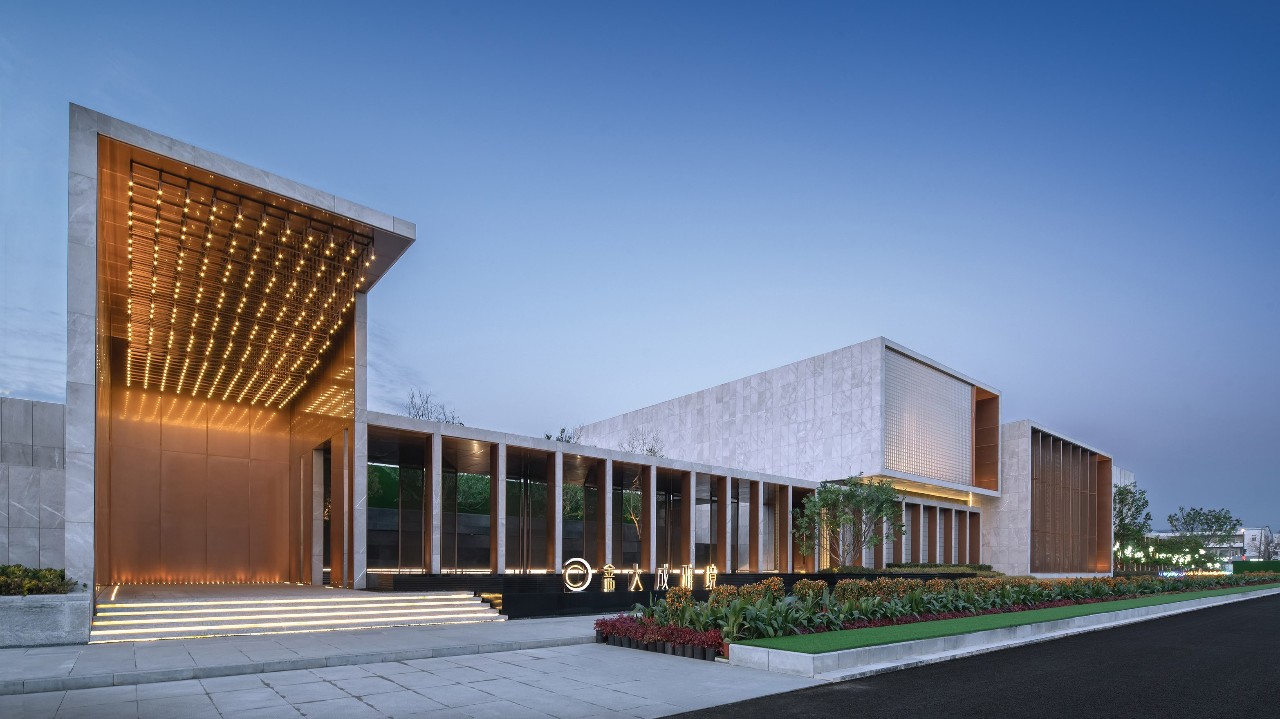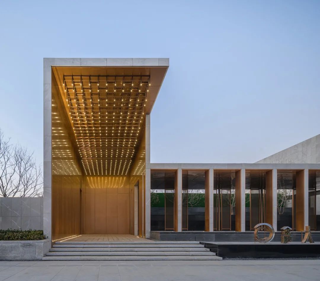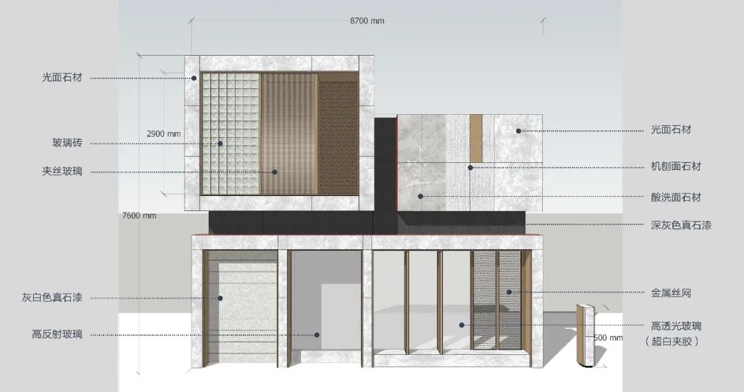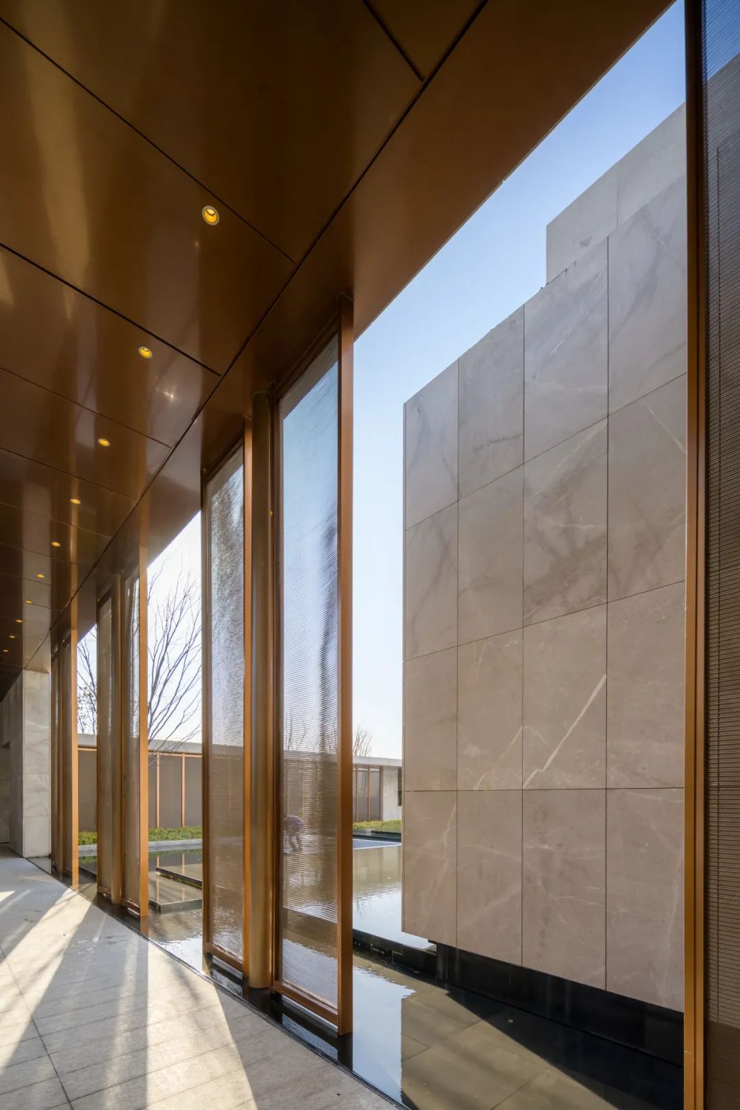 在整体大面积灰白色石材的包裹之下,香槟色金属材质的少量点缀则显得格外亮眼。金属板折角造型不采用型材,而是用不锈钢板折边,更突显工艺的精致度。