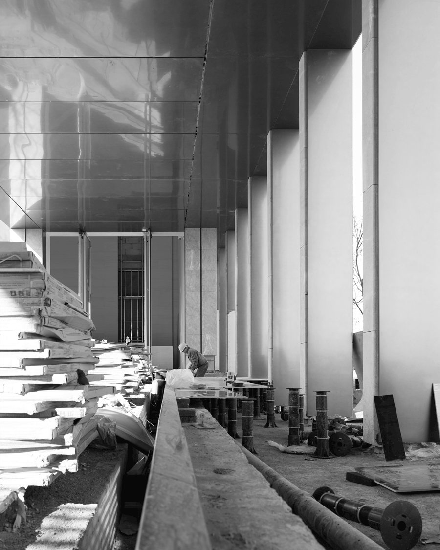 自然的光给空间最真实的反馈,空气触摸建筑的形状,优雅的几何形状成为穿行在空间中的线索,空间与自然的质感变得触手可及。施工现场也随之变成了流动的光影记忆录。