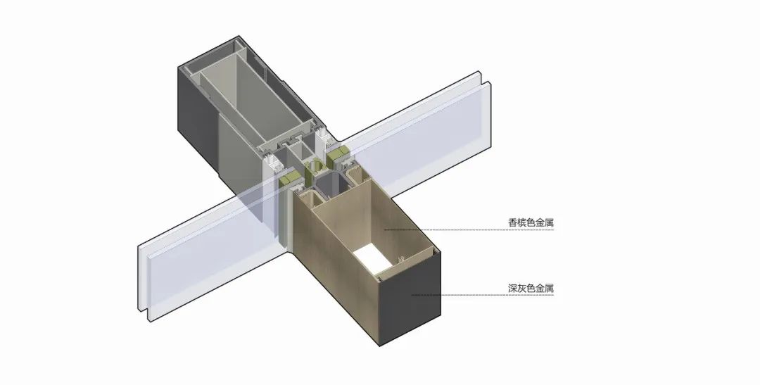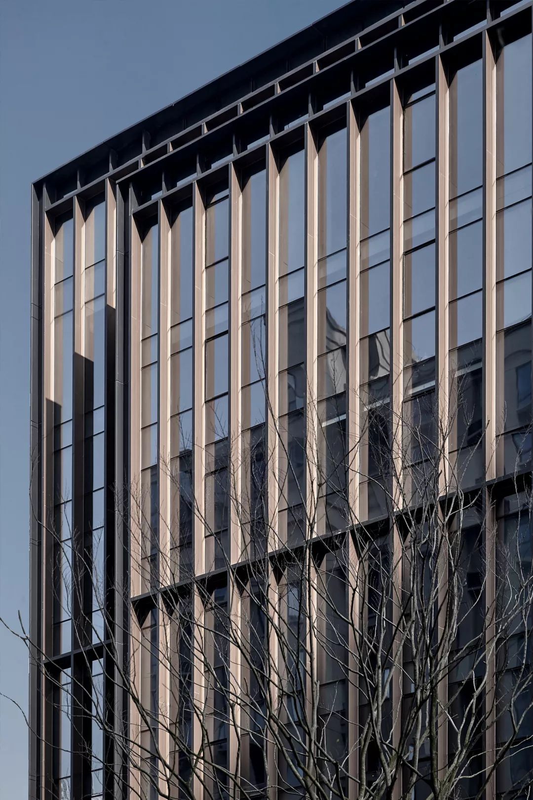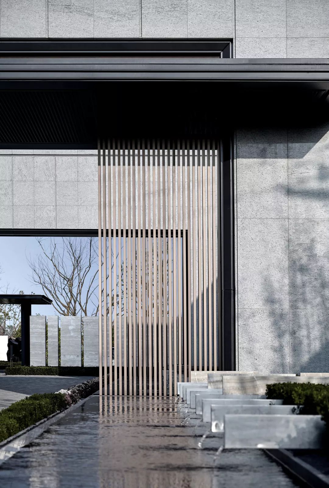 进入整个社区院落的第一个落客点同样令人过目不忘,这幢建筑以其“公建化立面”回应社区公共开放的功能。在正面竖挺灰色基调搭配侧面暖木色质感映衬下,将近32米的面宽尺度于近人体验感中被削弱,以通透明朗的界面与城市场景产生对话。