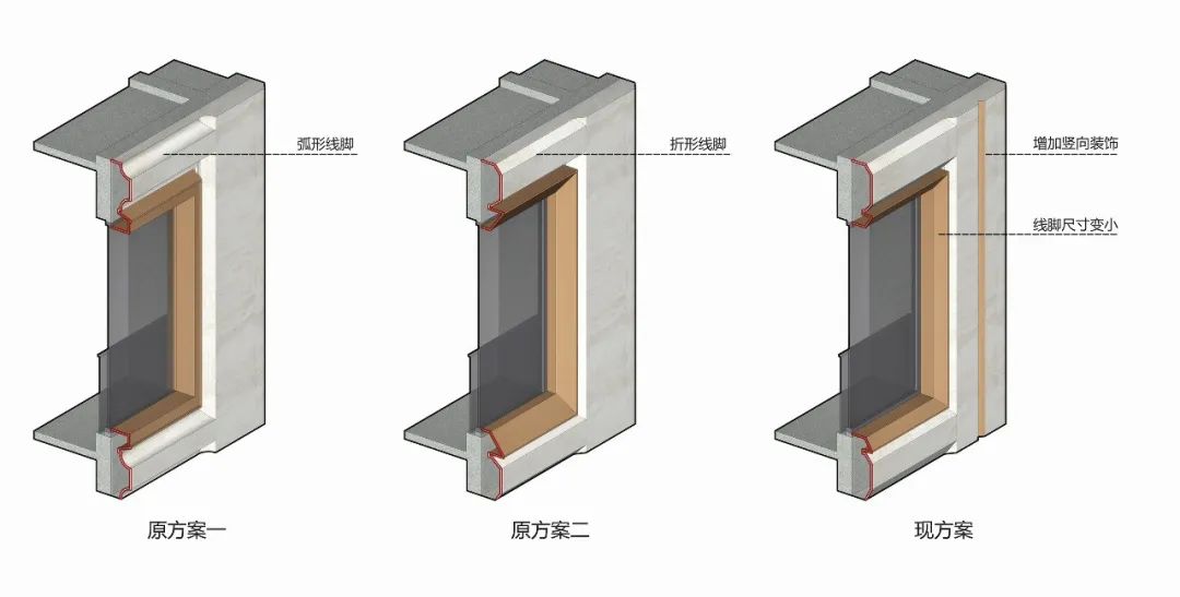 社区住宅建造过程中最值得重点关注的是关于楔形窗套的推敲,我们根据龙骨的比例与尺度,弧面变成直角等细节,现场搭建再重构了几轮窗套,最终实现了最平整、线条感最优化的方案。