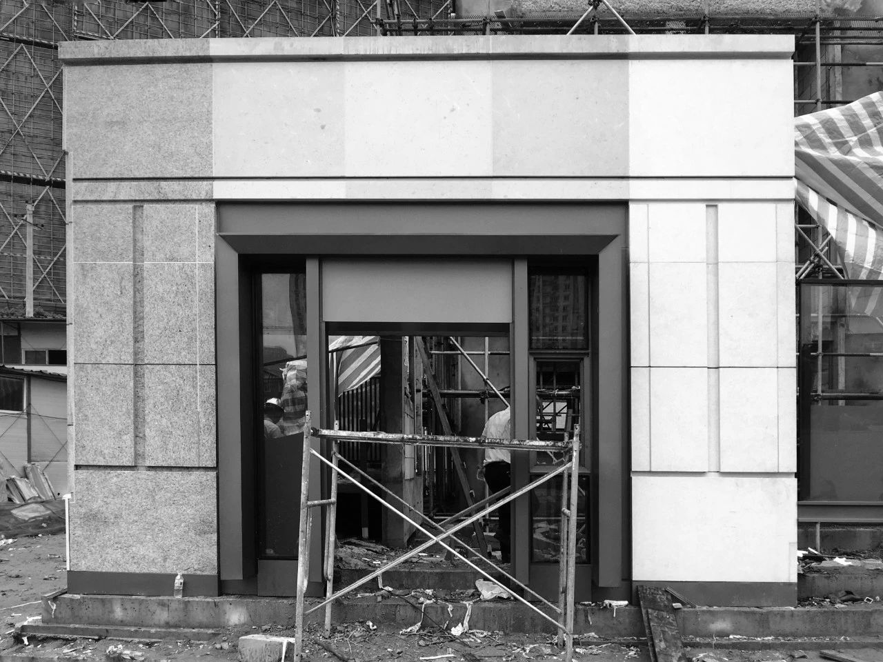 不同于常规的社区大门,我们选用超大尺度、分割规整的石材,尽量减少分缝,从整体上构建出现代简约的入户形象。同时采用28mm厚的蜂窝石材、背衬铝板的工艺,也能够有效保证超大尺寸石材不因较大跨度和气候等因素而产生变形。