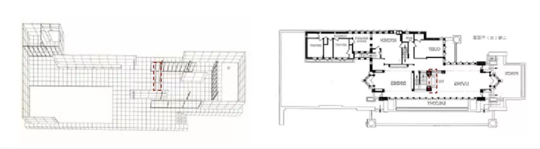 △ 德国馆中光井作为空间核心,其位置与水平镜像后的赖特罗比住宅中的壁炉一致