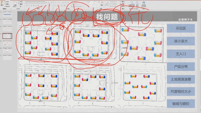 在第一期作业点评环节,李老师对综合最优解进行了深度剖析,通过案例解读如何做价值逻辑判断。住建师需要通过不同的变量,进行排列组合式的多方案比选,实现主推方案的选择,这也是寻找最优解的必经之路。同时设计师也需要通过不断的找问题来进行方案的优化,其中包含示范区位置、主入口位置、户型分布、土地资源的利用、尺度与轴线的把控等。