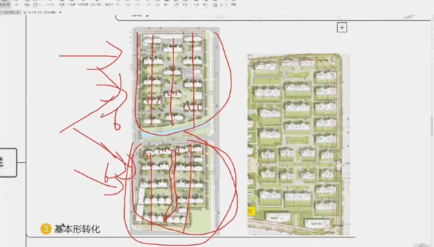李老师在第三期的课程中重点带大家认知洋房组团的基本形、以及延展出来的奇数列与偶数列的变化演进过程。通过对洋房组团的增减拼接,能够有效解决规划布局的多种应对方式。同时也分享了当不成组团的时候,如何通过寻找对其要素,如轮廓线、山墙缝、横竖向等,进行土地资源的最大化利用。在课程结尾部分,各种案例的轴线分析来解读关于整体规划仪式感的营造。